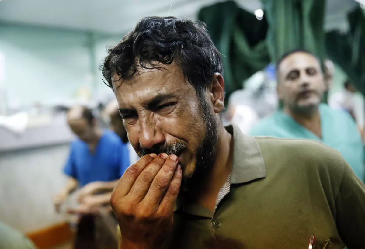 Seorang pria Palestina menangis setelah membawa seorang anak yang terluka karena terkena rudal Israel. Sumber: Los Angeles Time/ Lefteris Pitarakis / AP)[/caption]