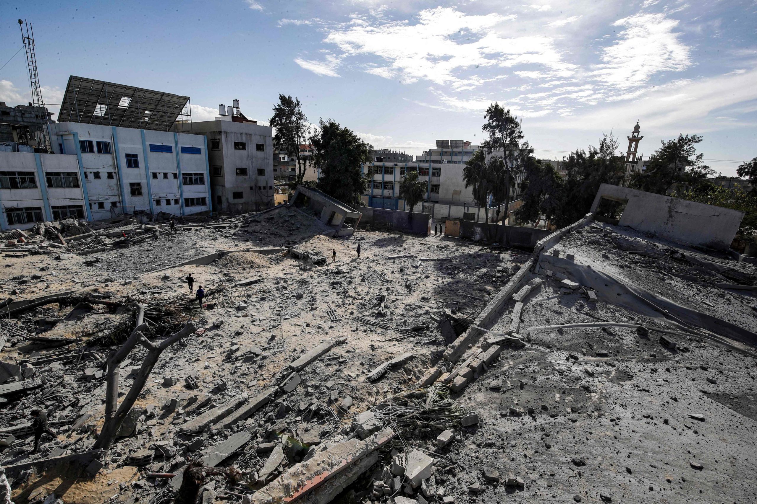 Bangunan-bangunan hancur di lokasi sekolah di kamp pengungsian Nuseirat Gaza, pada Februari 2024 (Foto: AFP)