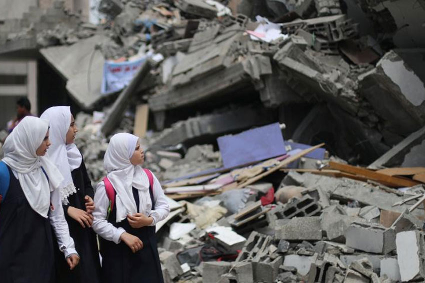 Para siswa tetap berangkat ke sekolah meski terancam pembunuhan oleh Zionis biadab, menjadi suluh harapan bangkitnya kembali Palestina di masa depan. FOTO/SINDOnews/Reuters[/caption]