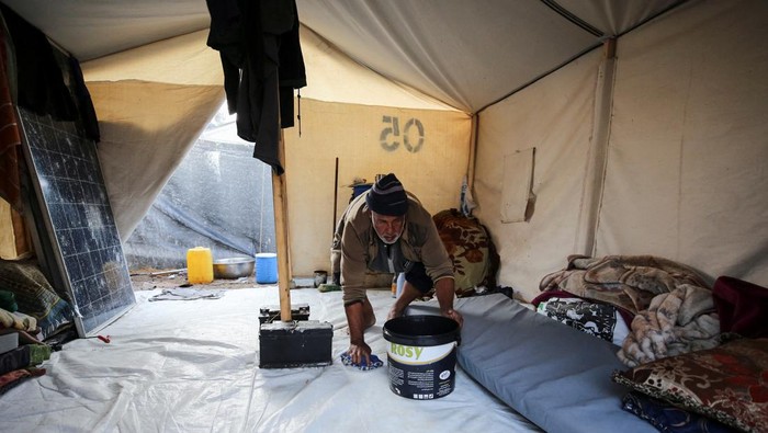 Tenda-tenda yang bocor mengakibatkan air hujan masuk, bahkan sebagian tenda ada yang hancur. Sumber: detik news/ REUTERS/ Dawoud Abu Alkas[/caption]