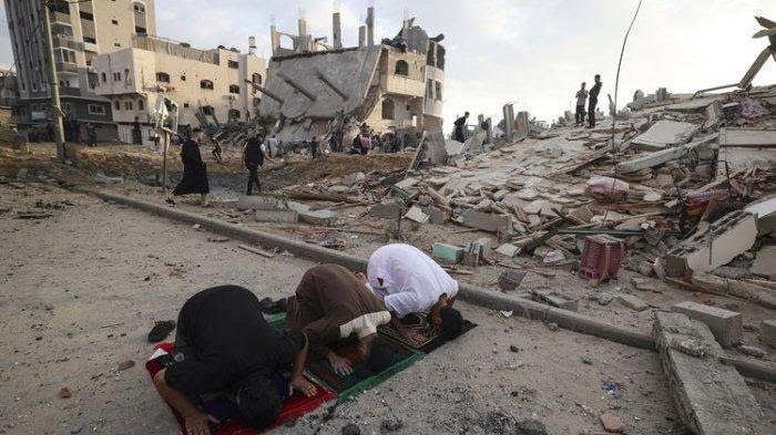 Ilustrasi warga Gaza, Palestina melaksanakan salat di tengah pengeboman militer Israel. ikhbar/Dok AFP[/caption] Kalimat ketergantungan mereka hanya pada Allah Swt. dapat kita temui dalam ragam adegan orang-orang Palestina hari ini. Kondisi yang mereka alami, dengan kehilangan, dengan kondisi serba kekurangan, bahkan tanpa anggota tubuh yang lengkap, wajahnya tak menyiratkan keputusasaan, kecuali sebatas ekspresi manusia. Seolah, mereka justru semakin mesra dengan Allah Swt. seabgaimana yang terjadi pada Rasulullah Saw. dan Abu Bakr As-Siddiq kala mereka terdesak di Gua Tsur. Kisahnya, dapat kita temukan dalam Qur’an, surat At-taubah ayat 40.